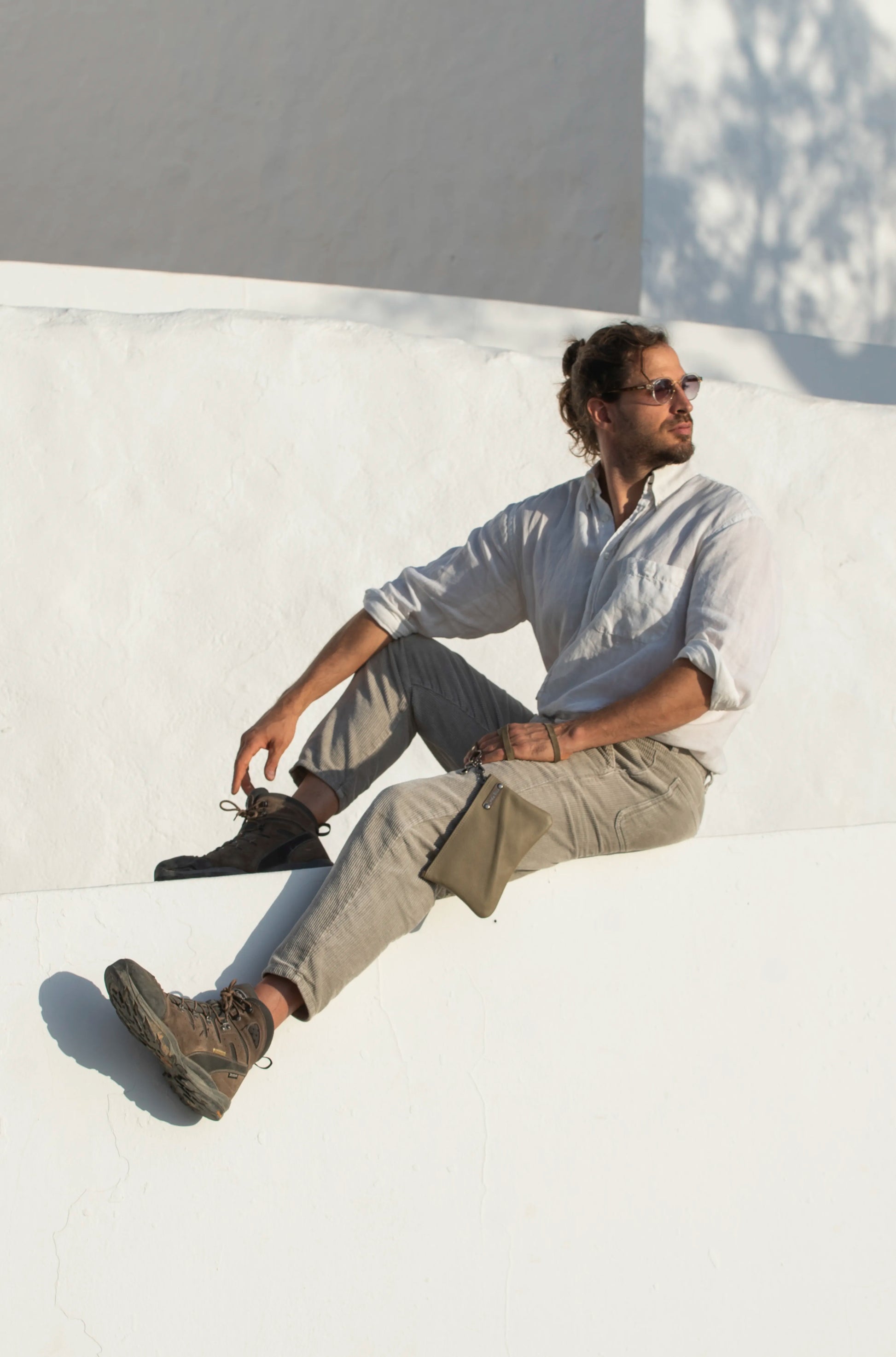 Handmade in Ibiza, this beige leather bag for men combines refined craftsmanship with effortless functionality.