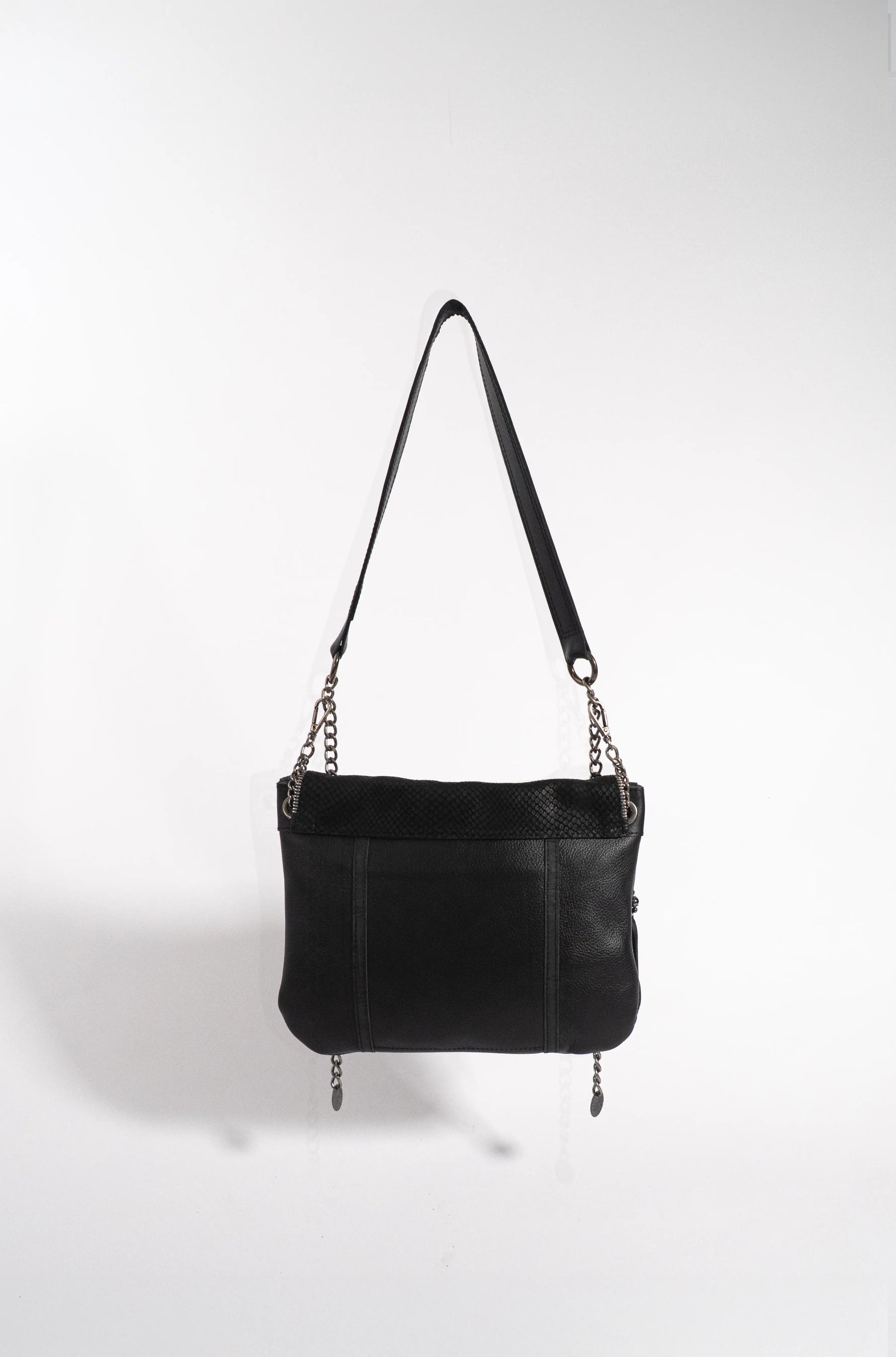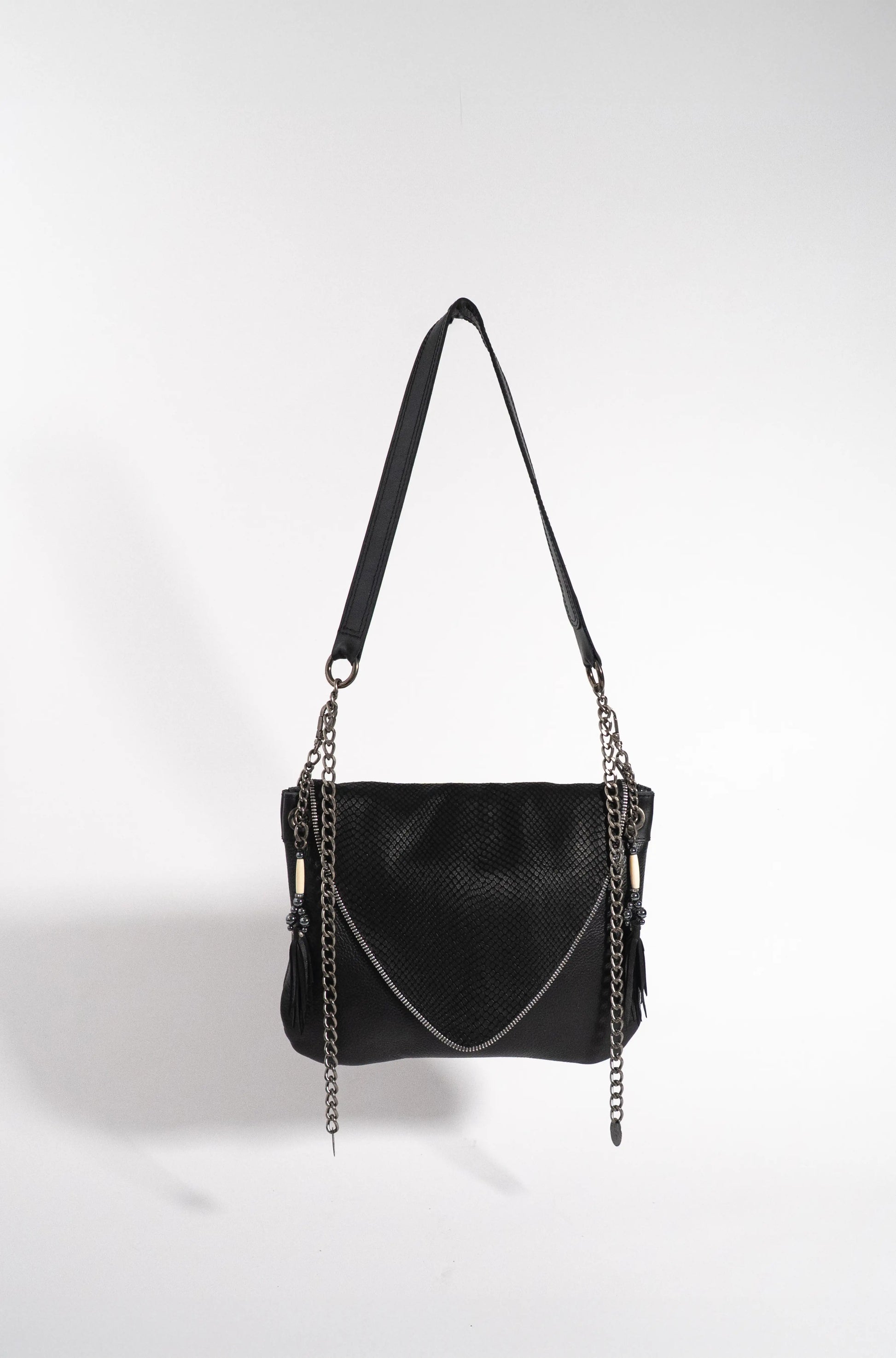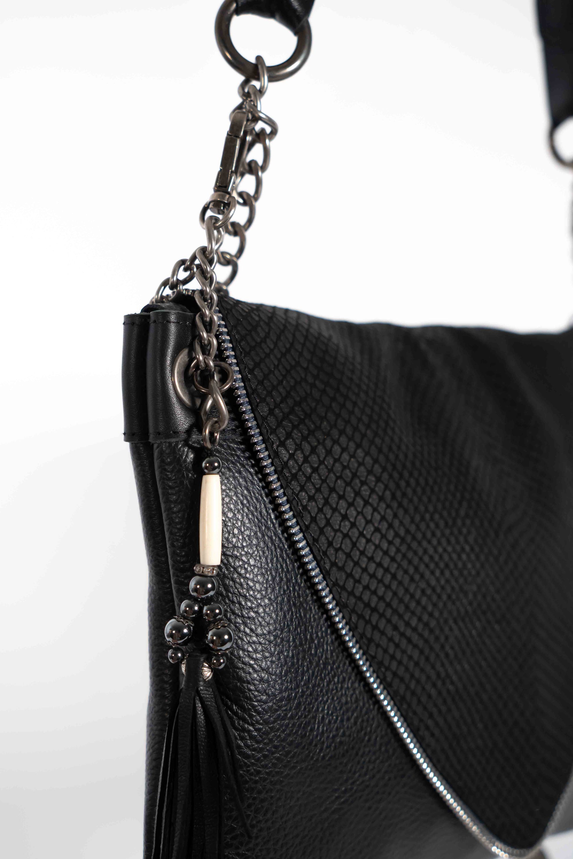 Our handmade black leather V handbag with textured black matte leather accent on the flap. The flap has zipper detail and the strap is chain and leather. It can be worn as a shoulder bag, a crossbody bag or as a clutch. There are fringe, bead and coin hanging accessories on either side of the strap.